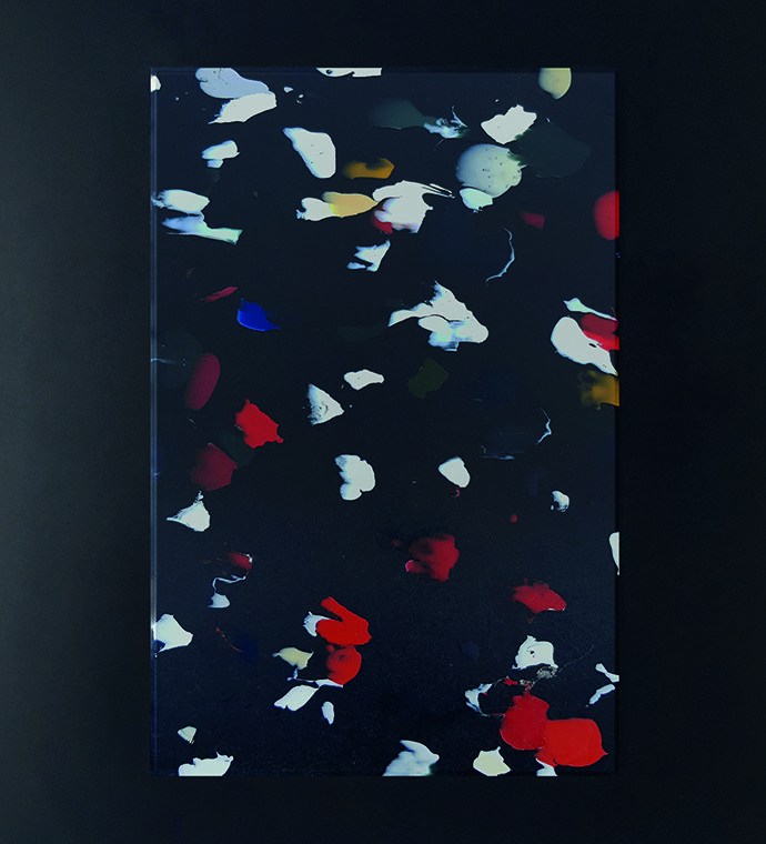Per creare questo motivo perlescente il materiale è stato dapprima fuso e poi impastato e mescolato quando era ancora caldo, con una tecnica molto simile a quella con cui si realizzano i bastoncini di zucchero colorati. Durante questo processo il materiale viene stirato e piegato numerose volte, aerandolo. Le minuscole bolle d’aria catturate all’interno della plastica traslucida riflettono la luce che genera un bagliore iridescente simile alla madreperla.